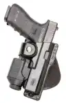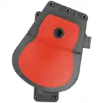 The Tactical Series is an active retention holster. To un-holster your firearm, unfasten the safety strap and rock the firearm back approximately one half on an inch followed by a deliberate upward motion. When re-holstering your firearm, insert the barrel first into the muzzle stud, snap the firearm into the holster and refasten the safety strap.