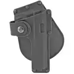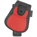 The Tactical Series is an active retention holster. To un-holster your firearm, unfasten the safety strap and rock the firearm back approximately one half on an inch followed by a deliberate upward motion. When re-holstering your firearm, insert the barrel first into the muzzle stud, snap the firearm into the holster and refasten the safety strap.
