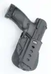 The Evolution series is the next step in the advancement of holster development. A tension adjustment screw is incorporated to allow the user to customize the ease of presentation and the security of retention, functioning with the proven Fobus passive retention design. The E2 series features one piece holster body construction, and like all Fobus holsters, the Evolution, is lightweight and includes steel reinforced rivet attachment and a protective sight channel. The paddle also includes a rubberized insert to provide both comfort and stability.