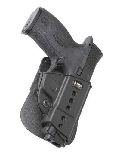 The Evolution series is the next step in the advancement of holster development. A tension adjustment screw is incorporated to allow the user to customize the ease of presentation and the security of retention, functioning with the proven Fobus passive retention design. The E2 series features one piece holster body construction, and like all Fobus holsters, the Evolution, is lightweight and includes steel reinforced rivet attachment and a protective sight channel. The paddle also includes a rubberized insert to provide both comfort and stability.
