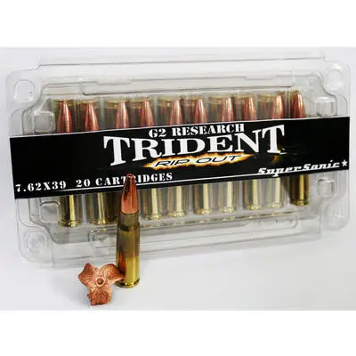 The G2 Research Radically Invasive Projectile (RIP) bullet is a copper hollow-point with the tip of the bullet consisting of eight trocar-shaped petals which, upon impact, act similar to a holesaw. RIP bullets act like a FMJ on impact in solid objects, and as the bullet passes through soft tissue it expends its energy. The design allows for an ease of entry by reducing the deceleration at the point of impact, causing potential energy to be conserved, thus delivering a deadly kinetic energy wave.