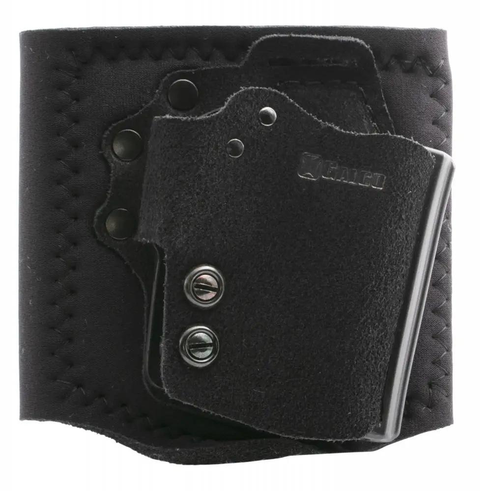 Combining some of the best features of the perennially popular Ankle Glove and the ultra-modern BlakGuard belt holster, the Ankle Guard is a huge step forward in ankle carry. An adjustable internal retention device secures the handgun at the trigger guard. Its "trench" style sight rail easily accommodates virtually all iron sights, and this generously-beveled sight rail also allows a smooth and easy return to the holster. The front of the Ankle Guard is cut low and even allows use of most carry-style optical sights. The Ankle Guard's neoprene ankle cuff is padded with genuine sheepskin and secured with Velcro. A slot in the holster body allows attachment of the optional Ankle Calf Strap. The cuff fits ankles up to 13" in circumference.
