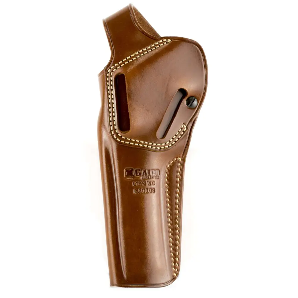 The DAO holster employs a retention strap for simplicity and security in the brush. Its retention strap has a large polymer tab, while the tension screw adjustments allow for a custom fit to your revolver. The DAO can be worn strong side or crossdraw and is constructed of steerhide and fits belts up to 1.75" wide.