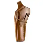 The DAO holster employs a retention strap for simplicity and security in the brush. Its retention strap has a large polymer tab, while the tension screw adjustments allow for a custom fit to your revolver. The DAO can be worn strong side or crossdraw and is constructed of steerhide and fits belts up to 1.75" wide.
