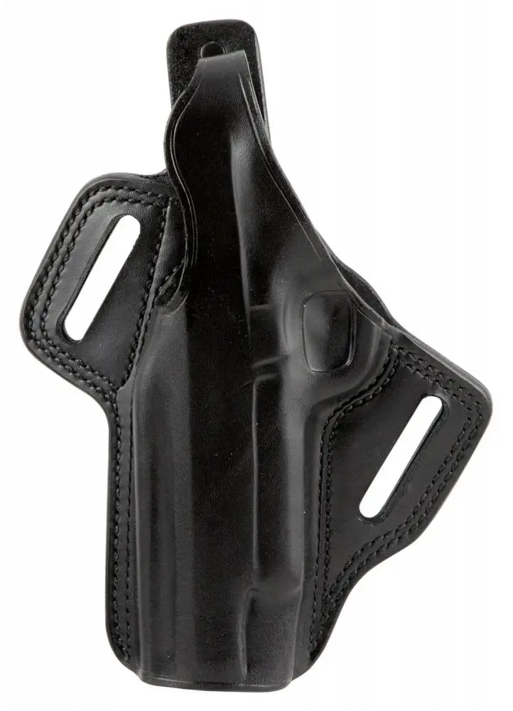 The FLETCH high ride holster's unique two-piece construction is contoured on the body side to the natural curve of the hip, keeping all the molding on the front of the holster, allowing for significantly more comfortable carry and a narrower profile than an ordinary pancake type holster*. Hand-molded to fit specific handguns. Features a reinforced thumb break for security, firing grip accessibility for speed, double-stitched seams for durability, and covered trigger guard for safety. The retention strap configuration is specific to individual firearms types, and varies depending on firearm model. *Not available on some holster fits. Fits- 5" barrel Colt 1911.
