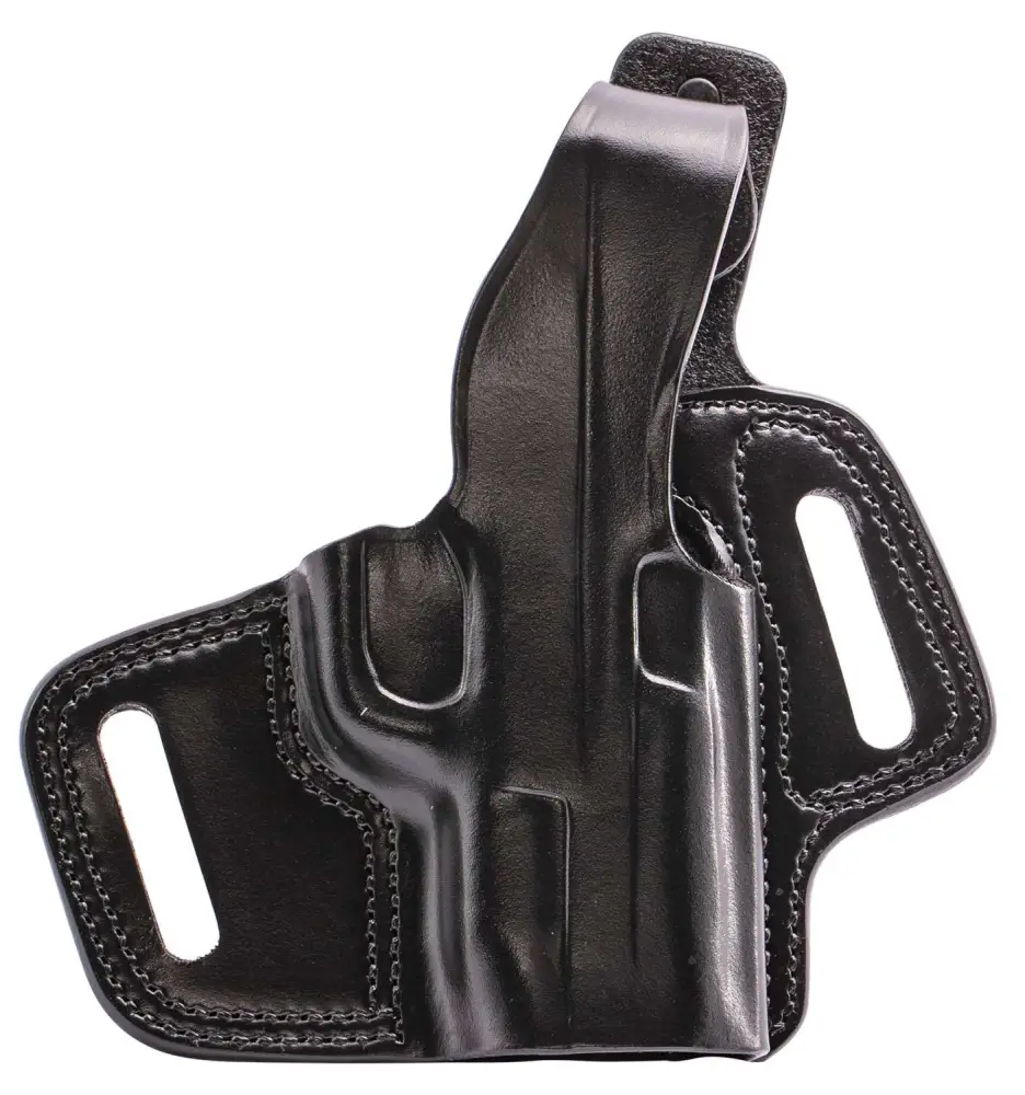 The FLETCH high ride holster's unique two-piece construction is contoured on the body side to the natural curve of the hip, keeping all the molding on the front of the holster, allowing for significantly more comfortable carry and a narrower profile than an ordinary pancake type holster*. Hand-molded to fit specific handguns. Features a reinforced thumb break for security, firing grip accessibility for speed, double-stitched seams for durability, and covered trigger guard for safety. The retention strap configuration is specific to individual firearms types, and varies depending on firearm model. *Not available on some holster fits.