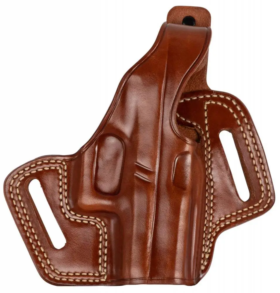 The FLETCH high ride holster's unique two-piece construction is contoured on the body side to the natural curve of the hip, keeping all the molding on the front of the holster, allowing for significantly more comfortable carry and a narrower profile than an ordinary pancake type holster*. Hand-molded to fit specific handguns. Features a reinforced thumb break for security, firing grip accessibility for speed, double-stitched seams for durability, and covered trigger guard for safety. The retention strap configuration is specific to individual firearms types, and varies depending on firearm model. *Not available on some holster fits.