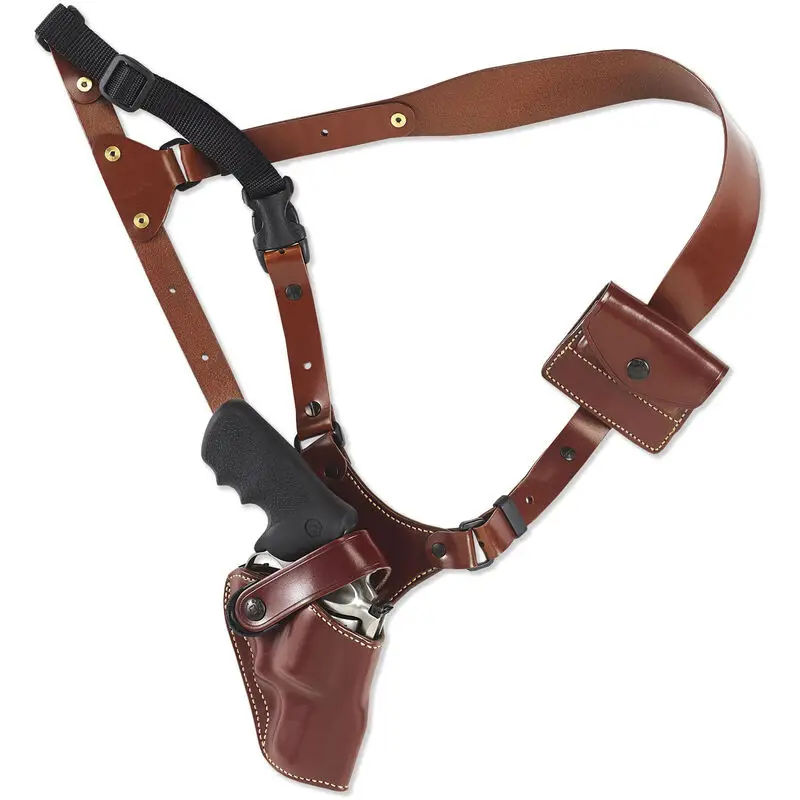 Galco's Great Alaskan shoulder holster system, carries a large-frame revolver or auto in an easily-accessible crossdraw torso position. It is ideal for protection when hunting, fishing, camping or hiking in bear country. Constructed of premium steerhide, the holster component is fully lined with smooth leather.The harness pivots at the holster attachment points for comfort, while its 2" width at the shoulder distributes weight extremely effectively. A Fastex-type buckle facilitates quick donning and removal of the holster system.