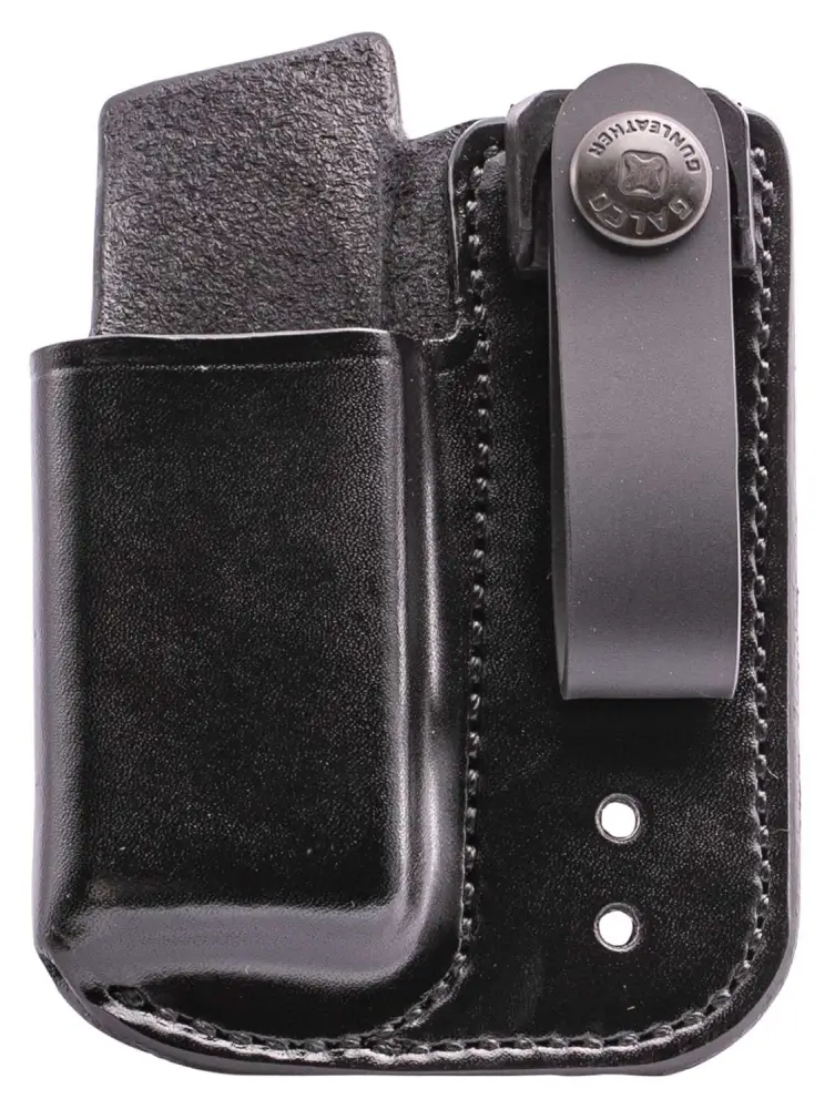 Galco proudly announces the IWBMC, the Inside the Waistband Magazine Carrier. A sleek, modern design constructed of premium steerhide, the IWBMC uses an offset belt attachment to lay flat and concealable inside the pants. It is provided with both a height-adjustable, snapping Santoprene belt loop and a tuckable metal belt clip, both sized to fit belts up to 1". Tuckable injection-molded polymer C-Hooks are also included for even greater conceal-ability. A raised sweat guard protects the wearers body from the magazine, and the magazine from the wearers bodily moisture.