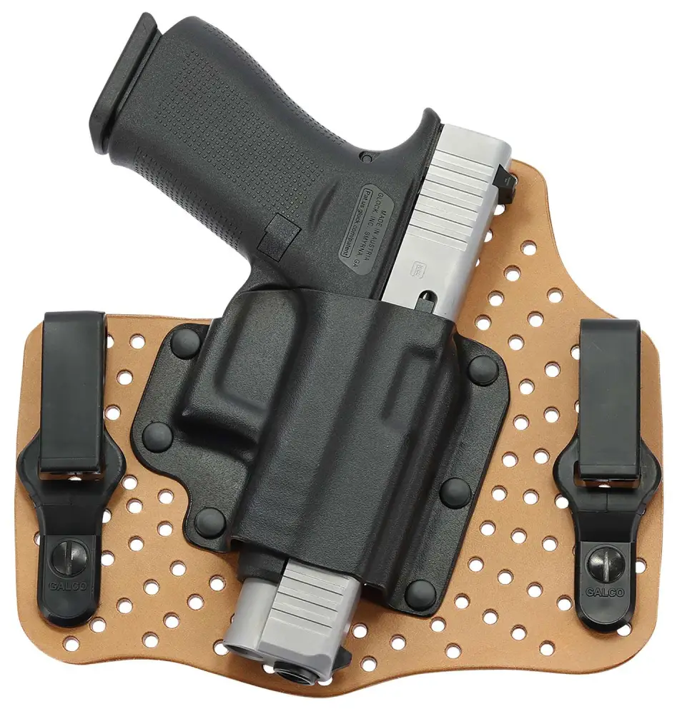 A cooler alternative to Galco's best-selling KingTuk IWB, the patented KingTuk Air provides a level of comfort previously unknown with broad-plated IWB holsters. The ventilated steerhide backing plate combined with a rigid Kydex holster pocket provides extreme comfort along with fast draw and easy holstering. Its removable metal belt clips can be moved up or down in the corresponding holes in the leather, enabling the user to set the carry height and angle to suit their unique preferences.