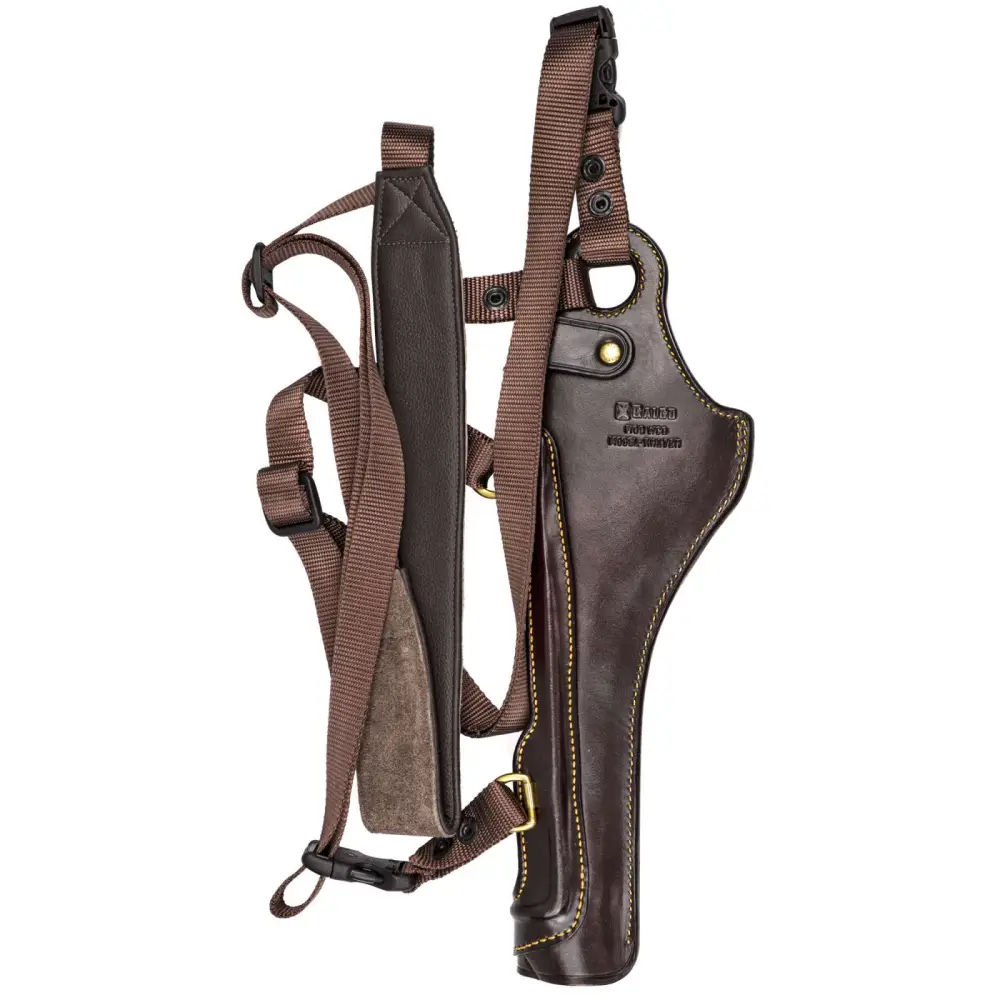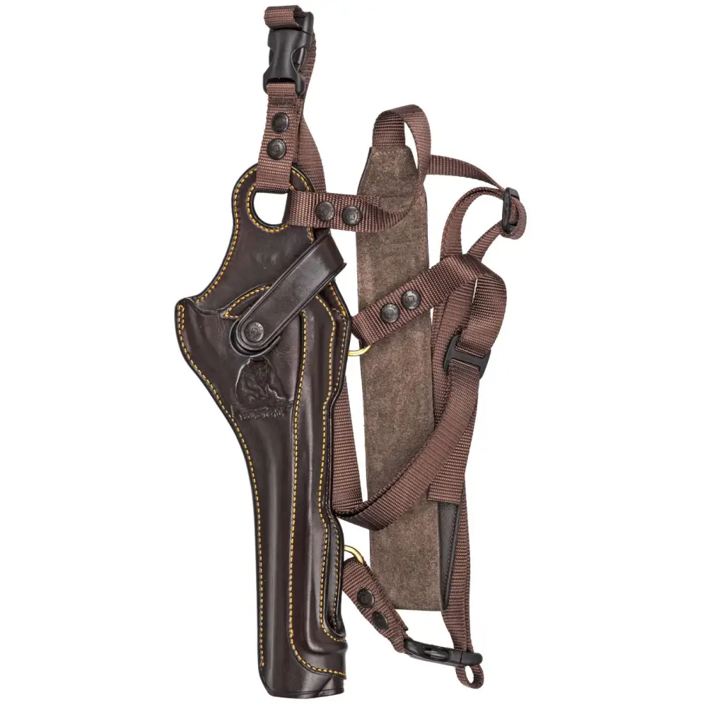 Galco's Kodiak Hunter is an big bore scoped handgun-hunting rig. Its design is for an abbreviated draw stroke through its open top, which allows for much faster target acquisition than a typical scabbard holster. The Kodiak Hunter comes assembled and includes holster, shoulder strap and torso strap.
