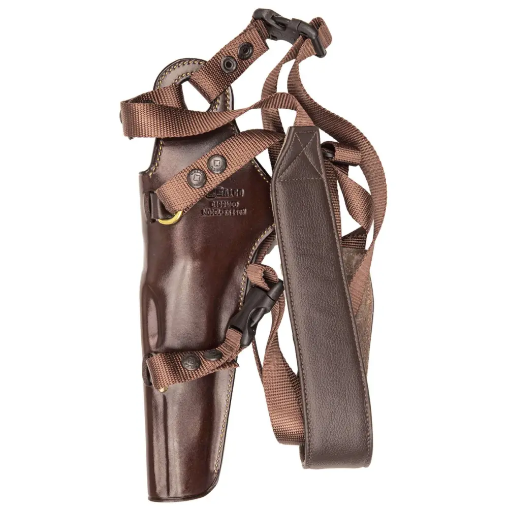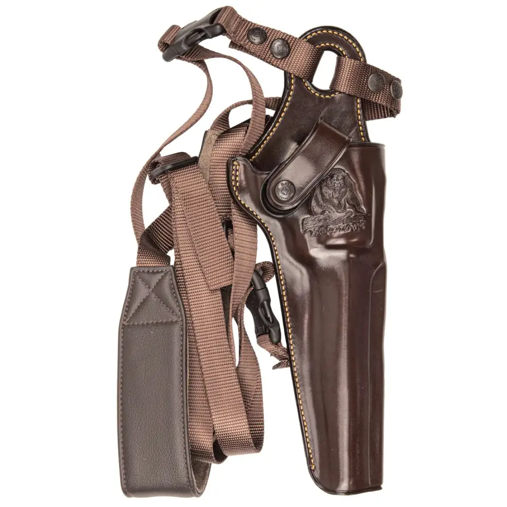 Designed to keep a large hunting handgun both comfortable and accessible, Galco's Kodiak Shoulder Holster carries a magnum revolver diagonally across the torso. Using the same principles as modern backpacks, it has a padded shoulder strap used in conjunction with a torso strap that allows for instant adjustments throughout a day spent afield. As the torso strap is tightened, weight is shifted off the shoulder strap, allowing for a full day of comfortable field carry. The Kodiak comes assembled and includes holster, shoulder strap and torso strap. It has a Havana Brown leather finish.