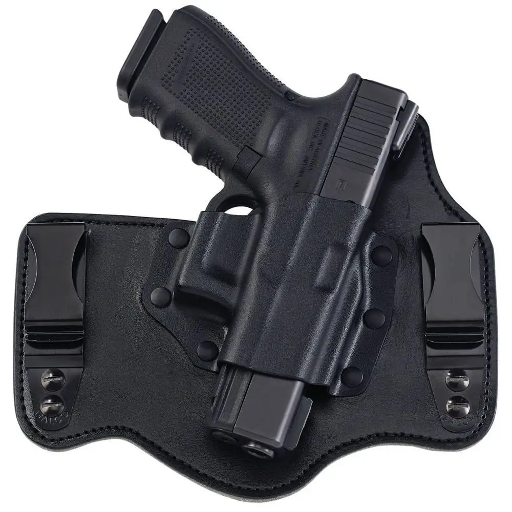 Galco's patented KingTuk IWB holster provides the best of both worlds: a comfortable backing plate made of lined saddle leather with Napa leather front combined with a rigid Kydex holster pocket for a fast draw and easy holstering. Worn inside the waistband, the KingTuk's removable metal belt clips (fitting belts up to 1.75") can be moved up or down in the corresponding holes in the leather, enabling the user to set the carry height and angle to suit their unique preferences.