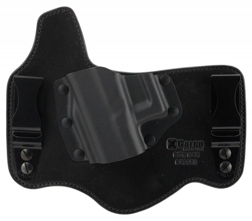 Galco's patented KingTuk IWB holster provides the best of both worlds: a comfortable backing plate made of lined saddle leather with Napa leather front combined with a rigid Kydex holster pocket for a fast draw and easy holstering. Worn inside the waistband, the KingTuk's removable metal belt clips (fitting belts up to 1.75") can be moved up or down in the corresponding holes in the leather, enabling the user to set the carry height and angle to suit their unique preferences.