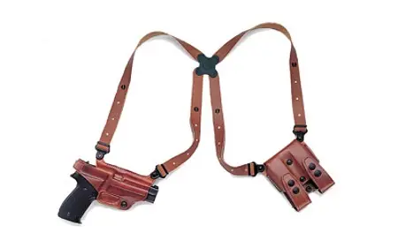 The Miami Classic Shoulder System is a favorite of professionals worldwide. A key component of this system is the spider harness which independently pivots at all four points and is connected by Galco's trademark clover-shaped Flexalon swivel back plate. This results in a perfect fit and lasting comfort for all sizes and shapes. The harness fits chests to 52". This system is constructed of premium steerhide and includes holster, harness with easily-concealable narrow straps, vertical double ammo carrier with secure flaps, and a set of system screws.