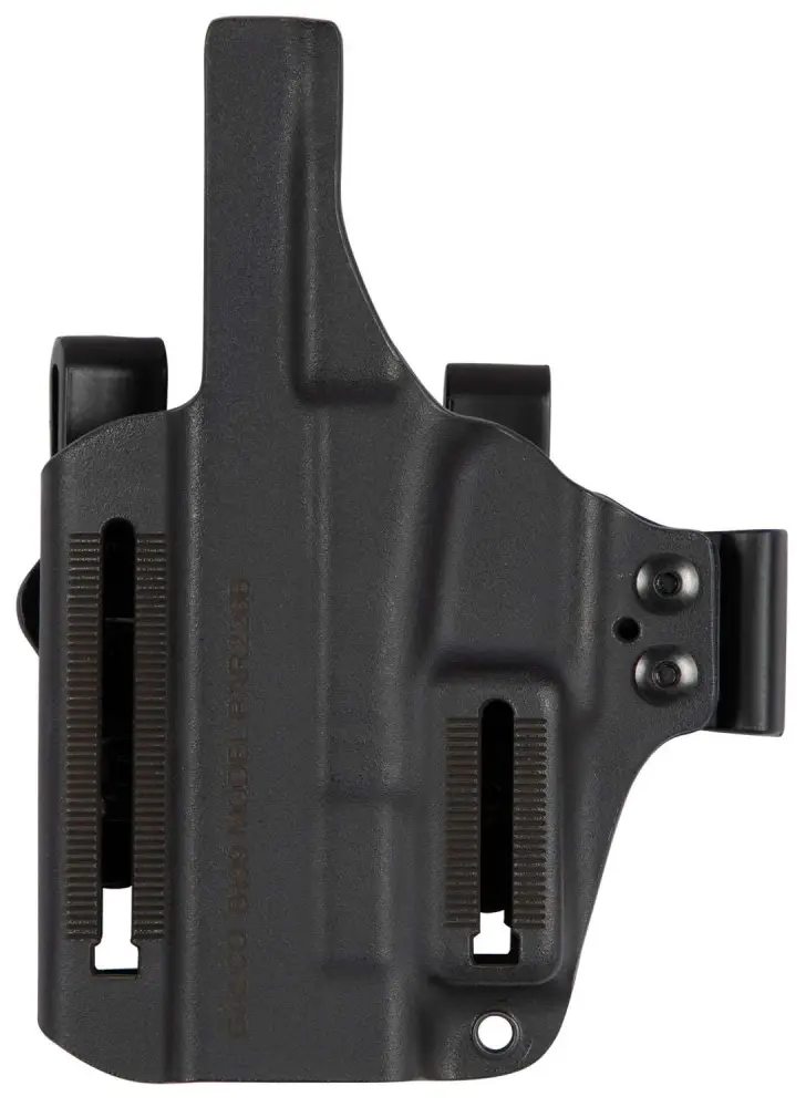 Adjustable for angle from strongside to crossdraw, the ambidextrous Paragon is ideally suited for the popular appendix mode of carry. With a Kydex holster body, the Paragon offers comfortable carry, fast draw and easy return to holster. Dual tuckable belt clips ride in slots fore and aft of the gun body, allowing adjustment for ride height and carry angle. Twin tension units allow easy adjustment of the draw stroke. Raised sweat guards on both sides of the handgun protect the wears body from the gun and promote a smooth and safe return to holster. Included with the Paragon is an optional claw-type stabilizing wing for those gun carriers who prefer it. The Paragon comes with Galco's patent-pending polymer UniClip for excellent concealment, stability and easy on-off capability, and functions well with single or dual clips.