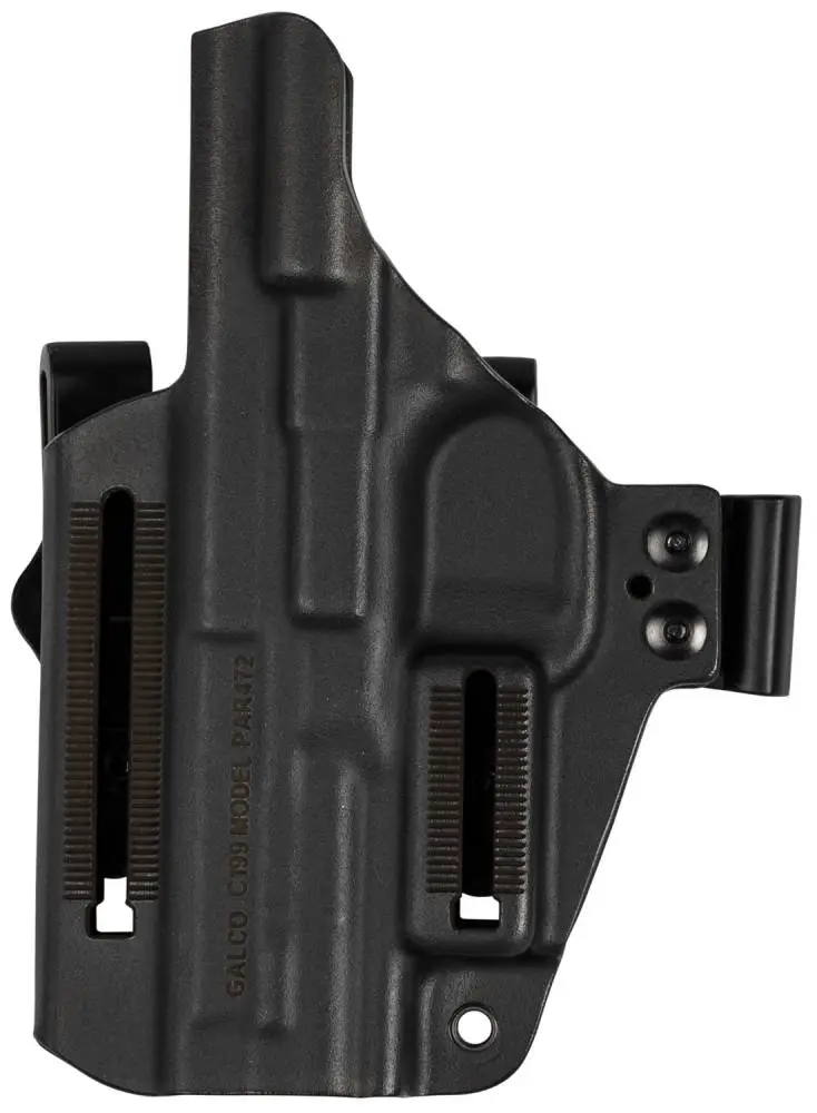 Adjustable for angle from strongside to crossdraw, the ambidextrous Paragon is ideally suited for the popular appendix mode of carry. With a Kydex holster body, the Paragon offers comfortable carry, fast draw and easy return to holster. Dual tuckable belt clips ride in slots fore and aft of the gun body, allowing adjustment for ride height and carry angle. Twin tension units allow easy adjustment of the draw stroke. Raised sweat guards on both sides of the handgun protect the wears body from the gun and promote a smooth and safe return to holster. Included with the Paragon is an optional claw-type stabilizing wing for those gun carriers who prefer it. The Paragon comes with Galco's patent-pending polymer UniClip for excellent concealment, stability and easy on-off capability, and functions well with single or dual clips.