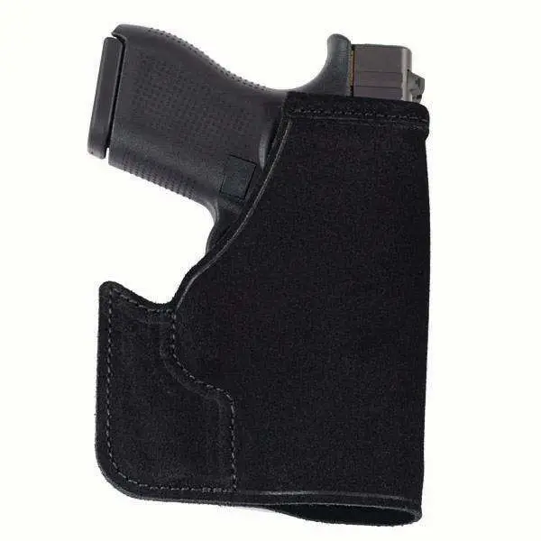 The Pocket Protector holster is designed for front pocket carry in pants or a jacket. It helps keep the firearm in the same general position, conceals the shape of the gun, and allows one-handed release of gun from both pocket and holster. Reinforcements at the holster mouth and beneath the trigger guard keep the holster stiff enough to allow a smooth draw and easy return, while also maintaining enough rigidity. The holster's hooked shape is designed to catch on the pocket so that, you can draw the firearm while the holster remains in your pocket or falls away. The Pocket Protector is ambidextrous and constructed of premium center cut steerhide.