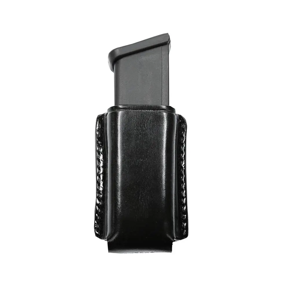 The QMC magazine carrier is constructed of premium saddle leather and features a hand-molded exterior for shape retention. It features an injection-molded nylon spring clip on the back, providing a secure fit to belt or most pants.