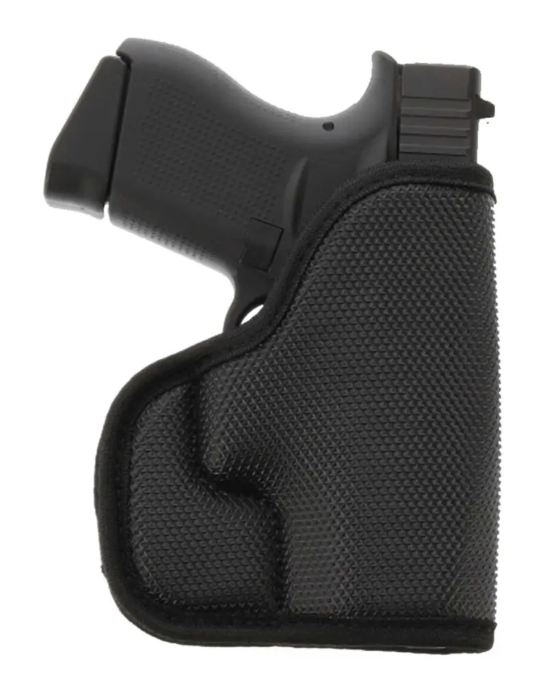 The StukOn-U is designed for front pocket carry in pants or a jacket. It keeps the firearm in the same general position so the grip can be quickly located during draw, conceals the shape of the gun so that its outline is not printed through the pants, and allows one-handed release of gun from both pocket and holster, especially when using a hooking draw technique to catch the edge of the holster on the pocket as the handgun is released. The holsters Gripper Shell surface assists in keeping the holster in the pocket during the draw.