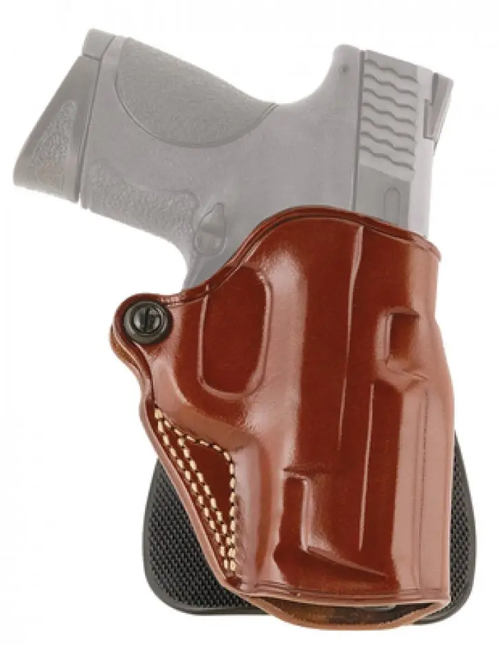 The open top design for speed, covered trigger guard for safety, and tension screw adjustment for added security, the Speed Paddle adds convenient on/off ability to the equation. It features Galco's patented copolymer injection molded belt lock paddle, which makes it possible to put on and take off this holster without removing your belt. Constructed of premium saddle leather, the Speed Paddle fits belts up to 1.75".