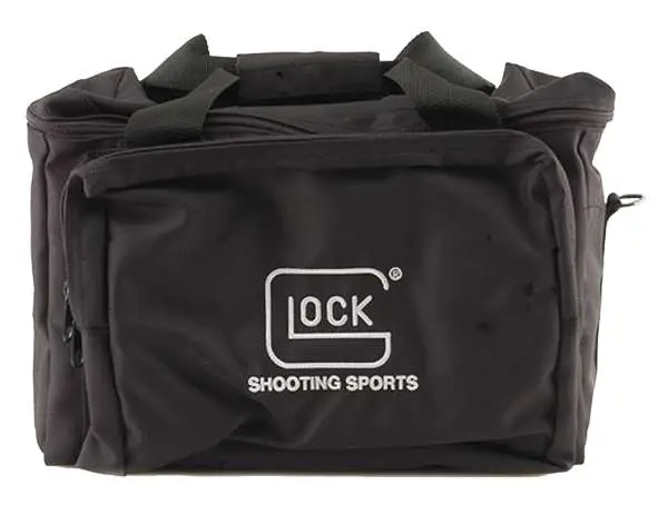 Constructed of durable, water-resistant 600 denier polyester, the Glock 4-Pistol Range Bag provides protection and easy access to your pistols, ammo, magazines and safety equipment. The front of the bag has a zippered pouch for safety glasses, ear protection, water bottle and personal items. The back side contains a covered magazine storage compartment that can accommodate 6 double-stack or 12 single-stack magazines. The Glock 4-pistol range bag is easy to carry with the padded handles or over the shoulder with the 2" wide carrying strap.