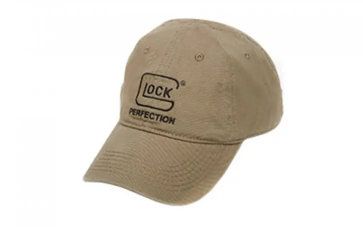 Glock's Perfect Unstructured Chino hat features an adjustable velcro strap on the back for customized comfort. The hat has stitching with the Glock Perfection logo on the front and a smaller one towards the back.