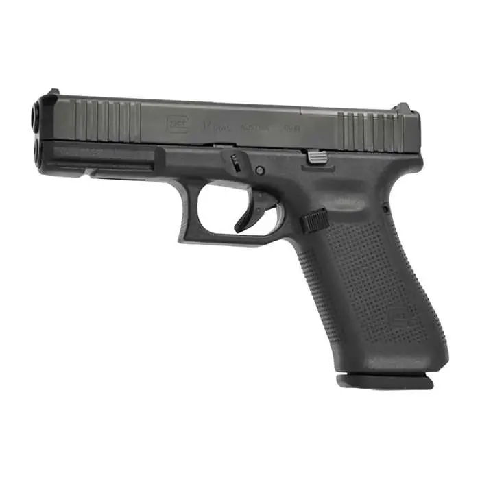 The G17 Gen5 features a no finger grooved, multiple backstrapped, rough textured frame with hundreds of miniature spikes which results in remarkable traction for extreme environments and gloved operators. The frame also features a smooth trigger, reversible mag release, and ambidextrous slide stop. The magazine comes with a floor plate which is extended at the front for faster magazine change, and an orange follower, while the flared mag-well makes it easier to funnel the magazine into the mag-well. Glock's nDLC finish provides a tougher, more durable protection against corrosion and scratching. The Glock Marksman barrel features a barrel rifling which delivers improved accuracy. This Glock Gen5 MOS FS model has front slide serrations, fixed sights, Modular Optic System, and a 17-round capacity.