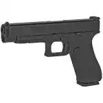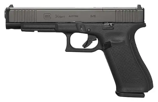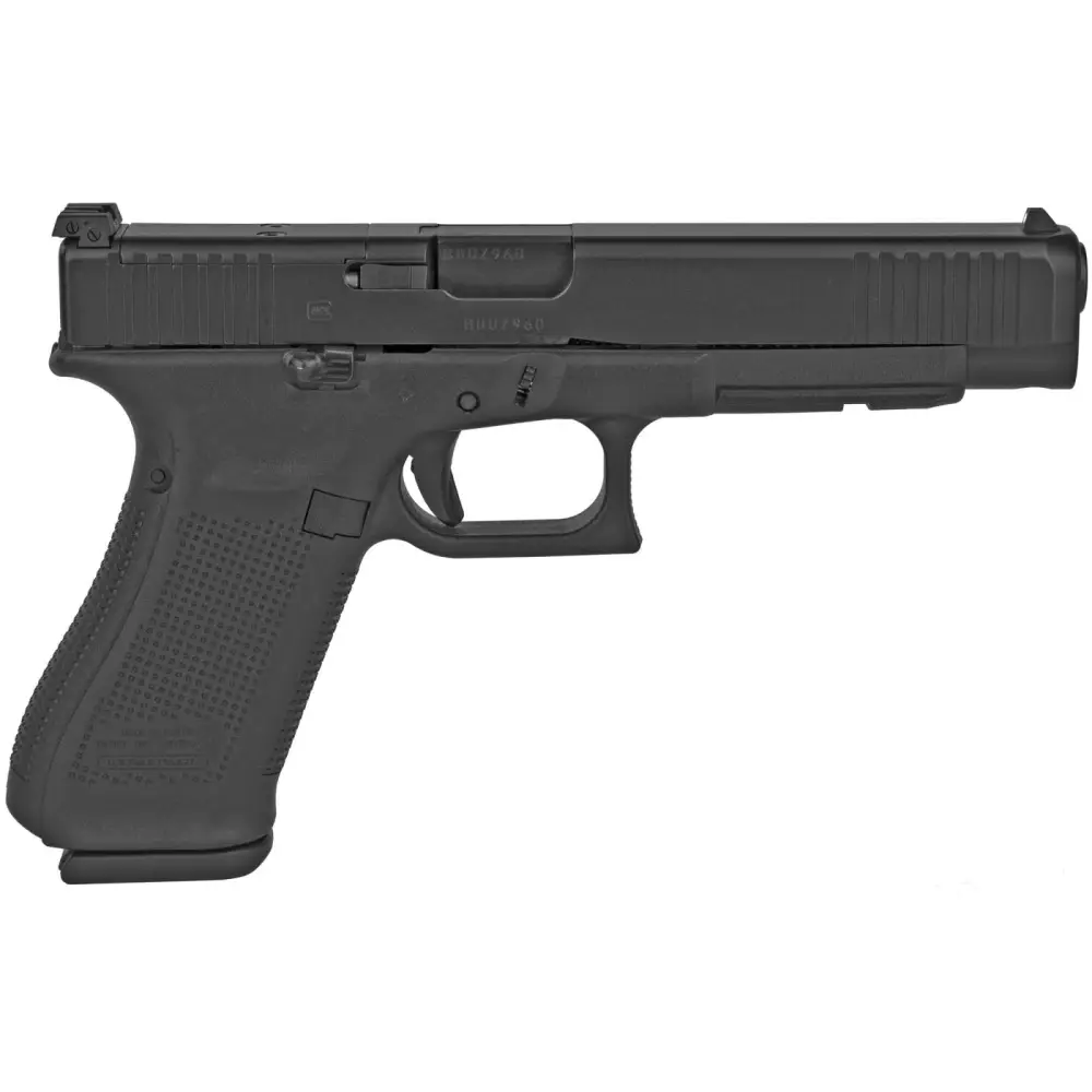 Glock's G34 Gen5 MOS features an extended barrel and greater slide dimensions, making it a favorite among sport shooting competitors. Design enhancements include the Glock Marksman Barrel (GMB) which delivers increased accuracy with enhanced polygonal rifling and an improved barrel crown, no finger grooves, ambidextrous slide stop levers for better versatility and control, and an nDLC finish, which is a tougher and more durable finish that is exclusive to the Glock manufacturing process. This FS model has a black finish, front slide serrations, adjustable sights, and a 10-round capacity. It features the Modular Optic System (MOS) to simplify mounting of popular optics without costly custom machining of the pistol's slide.