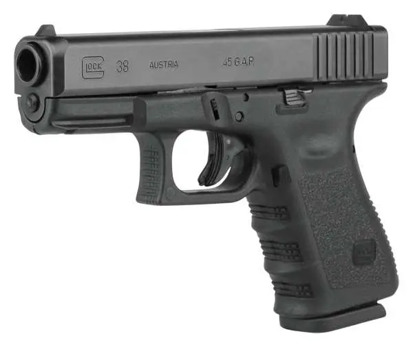 The Glock 38 is a compact .45 G.A.P. offering practical handgun power in a size concealed carriers need and demand. Plainclothes law enforcement, as well as military and civilian carriers, will appreciate the eight round capacity of the accurate and powerful .45 G.A.P. cartridge in a model sized much like other traditional caliber Glock compacts.