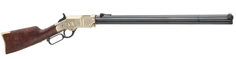 The BT Henry 200th Anniversary Edition is limited to 200 units. With serial numbers 001BTH200 to 200BTH200. Featuring a hardened, polished brass receiver engraved with "One of 200" on the left side and an engraved picture of BT Henry on the right side with scroll engraving on both sides. The rifle has a fancy American Walnut stock with a straight grip and a brass buttplate. Rifle is a toggle link lever action.