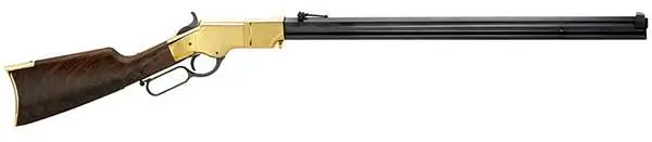 The Henry Original Rifle is true to Henry's 1860 patterns and patents, and virtually identical aside from concessions necessary to adapt to the 45 Colt centerfire rounds. This Lever Toggle Link Action rifle features a polished, hardened brass receiver with the same tensile strength as steel. It is fitted with a one-piece octagonal blued steel barrel and magazine. Its fancy-grade American Walnut stock has a brass buttplate. The Henry Original rifle has a classic folding ladder rear sight and blade front, traditional half-cock safety hammer notch, and no modernized manual safeties.