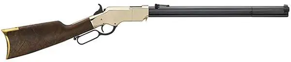 developed further on Henry's rendition of the 1860 patterns and patents. It utilizes a hardened brass receiver, one-piece octagonal barrel and integrated tube magazine. The rifle also features a fancy grade American Walnut stock with brass buttplate, a classic folding ladder rear sight and blade front, traditional half-cock safety hammer notch, and no modernized manual safeties.