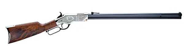 The Henry original silver deluxe engraved rifle features a lever action and an octagon blued steel barrel. It utilizes a steel receiver with engraving, split magazine with external follower, a rotating barrel collar for front-end loading, a presentation-grade American Walnut stock and a distinctive crescent buttplate with the cleaning rod trapdoor. This Silver Deluxe Engraved version uses a brass frame, but with an electroless nickel plating on the frame, buttplate, shell carrier, and magazine cartridge follower.