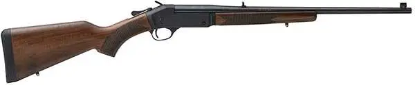 Henry's Single Shot centerfire rifle features a matte finish on steel frames and a highly polished finished on hardened brass frames. It features a 22" round barrel, brass bead front sights, Leaf Rear sights and is drilled/tapped for optional scope use. The stock is constructed of walnut, with a curved pistol grip wrist and a straight English wrist and brass buttplate. The action has no external manual safety; it uses a rebounding hammer that can't touch the firing pin unless the trigger's deliberately pulled, and an interlock system that doesn't allow the barrel to open if the hammer's cocked, or the barrel to close if the hammer's cocked while it's open.