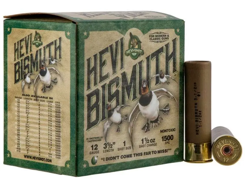 The HEVI-Bismuth Waterfowl shells utilize bismuth, which is 22% denser than steel, to deliver more downrange lethality at an affordable price. And, it's safe for older fixed choke and fine classic doubles shotguns.