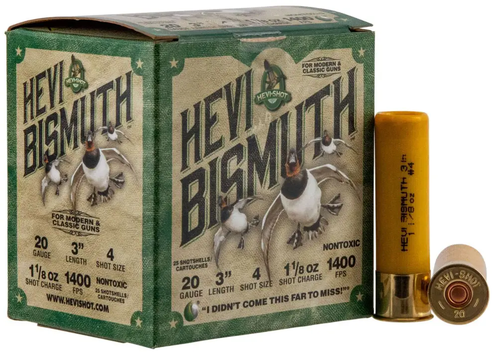 HEVI-Bismuth Waterfowl shells utilize bismuth, which is 22% denser than steel, to deliver more downrange lethality at an affordable price. And, it's safe for older fixed choke and fine classic doubles shotguns.