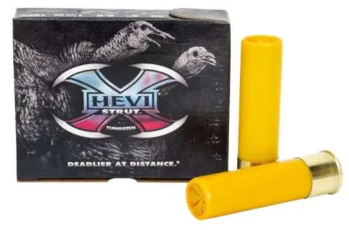 HEVI-X Strut is a tungsten-based turkey load that offers higher energy on target than lead due to a payload that is heavier than lead #6 tungsten pellets layered over heavier than steel HEVI-X #5 tungsten pellets plus a higher launch speed, made possible by the strength of the tungsten pellets.