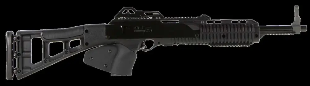 Hi-Point's 4595TS Carbine has features an all-weather, polymer skeletonized stock with an internal recoil buffer and sling swivels. The receiver utilizes Weaver-style rail, scope base, and fully adjustable sight. It has a quick on/off thumb safety, grip-mounted clip release, last round lock open feature. This CA compliant model has a 17.5" barrel, black metal finish, and a 9-round magazine.