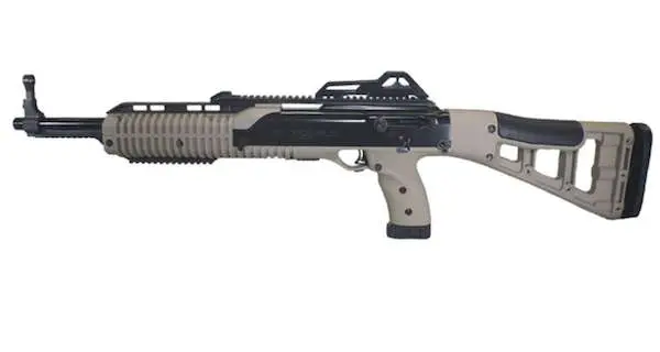 Hi-Point's 4595TS 45 ACP carbine has an all-weather, polymer skeletonized stock with an internal recoil buffer, multiple Weaver-style rails, a sling, swivels, and scope base. It has a quick on/off thumb safety, grip-mounted clip release, last round lock open feature, and fully adjustable sights (post front, peep rear). The 4595TS carbine has a 17.5" barrel for an OAL of 32". Hi-Point produces affordable, American-made firearms featuring 100% American parts and assembly. Hi-Point carbines are +P rated and accept all factory ammunition. This model has an FDE stock with black metal finish and includes a 9-round magazine.
