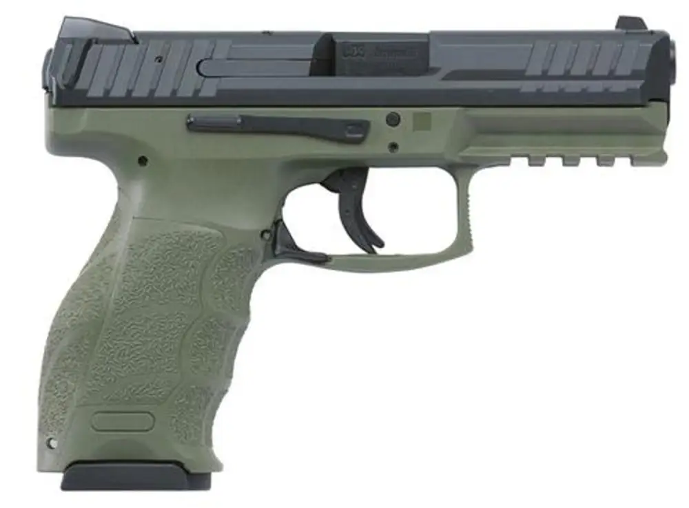 The VP Series is Heckler & Koch's first striker-fired HK since the P7 series pistols. It is well-suited for civilian sport shooting, security, military, and law enforcement use. The VP Series integrates a striker firing system with an enhanced, HK "light pull" trigger. The cold hammer-forged barrel made from cannon grade steel ensures long service life, as does the polygonal bore profile which also provides a slight increase in muzzle velocity. It uses an ergonomic handgun grip design that includes three changeable backstraps and six side panels, accommodating all hand sizes. Molded finger grooves in the pistol's grip is ideal for an operator's hand for optimal shooting. A unique VP feature is HK's patented rear-mounted charging supports on each side of the slide provide better gripping leverage for racking the slide rearward. The machined steel slide is protected from corrosion and wear by HK's hostile environment finish and all metal components, including springs and pins have superior metallurgy. The VP9 also has an extended Picatinny MIL-STD-1913 rail molded into its polymer frame, ambidextrous controls, a slide release on both sides of the frame, and the paddle-style magazine release. This model has an OD Green frame, black slide with 3-dot sights, and includes two (2) 10-round magazines.