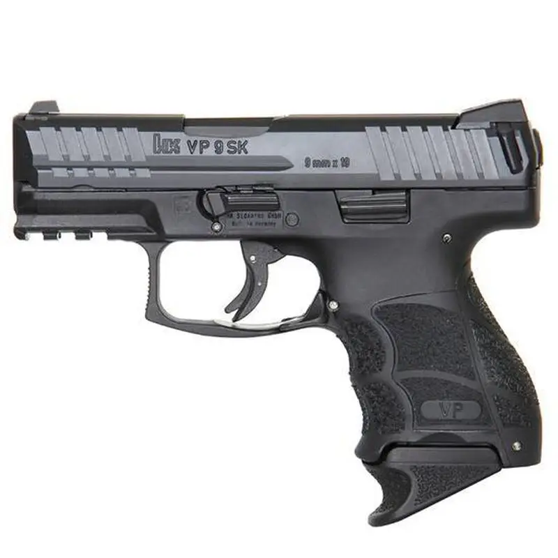 The VP Series is Heckler & Koch's first striker-fired HK since the P7 series pistols introduced in the 1980s. It is well-suited for civilian sport shooting, security, military, and law enforcement use. The VP Series integrates a striker firing system with an enhanced, HK "light pull" trigger. HK's cold hammer-forged barrel made from cannon grade steel ensures long service life, as does the polygonal bore profile which also provides a slight increase in muzzle velocity. Slide releases are present on both sides of the frame, and the paddle-style magazine release can be easily activated by left- or right-handed shooters. A unique VP feature is HK's patented rear-mounted charging supports on each side of the slide provide better gripping leverage for racking the slide rearward. The machined steel slide is protected from corrosion and wear by HK's hostile environment finish and all metal components, including springs and pins have superior metallurgy. VP SK subcompact models feature a more concealable design with a shorter barrel, abbreviated Picatinny MIL-STD-1913 rail, and a compact grip frame which retains the adjustable VP grip feature of interchangeable backstraps and lateral grip panels. This model comes equipped with 3-Dot sights and includes one flat base and one extended floorplate 10-round magazine.
