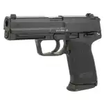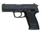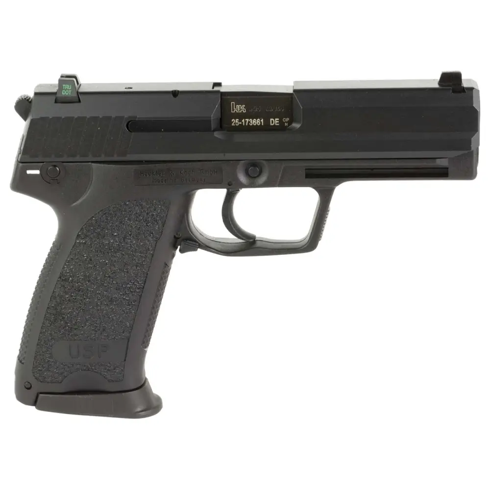 All USPs feature a fiber-reinforced polymer frame stiffened by stainless steel inserts at areas subject to stress and friction. HK pioneered this use of polymer materials in the production of handguns more than 30 years ago with the development of the VP70Z and P9S pistols. Using a modified Browning-type action with a special patented recoil reduction system, the USP recoil reduction system reduces recoil effects on pistol components and also lowers the recoil forces felt by the shooter. The USP recoil reduction system is insensitive to ammunition types and requires no special adjustment or maintenance. Variant 1 is double action/single action with SAFE position; control lever (manual safety/decocking lever) is mounted on left side of the frame. This model comes with night sights and three 10-round magazines. It is CA compliant.