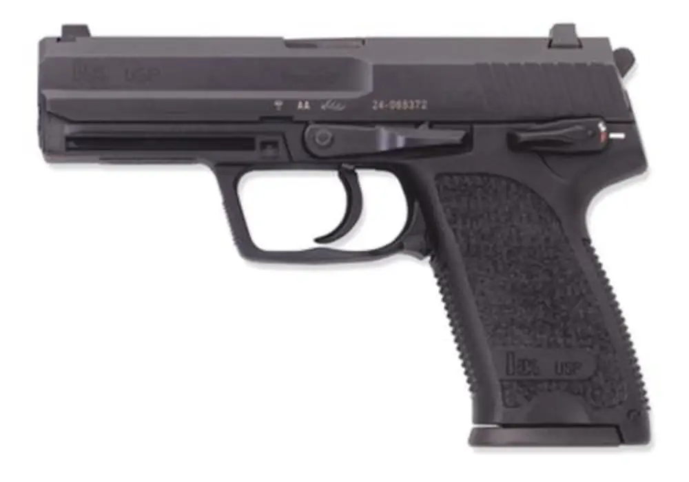 The HK USP (Universal Self-loading Pistol) is an accurate and ultra-reliable handgun. It utilizes a fiber-reinforced polymer frame stiffened by stainless steel inserts at areas subject to stress and friction. The control lever, a combination safety and decocking lever, is frame mounted and quickly accessible, unlike the slide-mounted safeties. The modular design of the USP's internal components allows the control lever function to be switched from the left to the right side of the pistol for left-handed shooters. The USP features a polygonal bore barrle, one-piece steel slide extended release, universal mounting grooves, and ambidextrous magazine release lever. This V1 model has a black frame with blued slide, night sights, and comes with three 10-round magazines.
