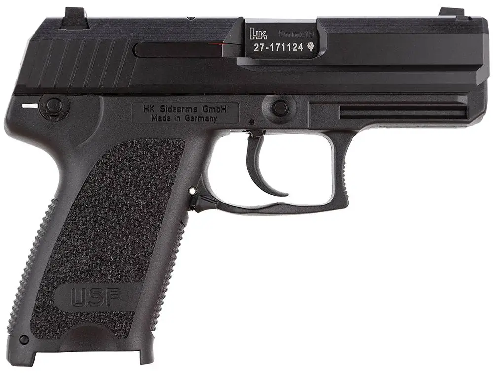 The HK USP (Universal Self-loading Pistol) is an accurate and ultra-reliable handgun. It utilizes a fiber-reinforced polymer frame stiffened by stainless steel inserts at areas subject to stress and friction. The control lever, a combination safety and decocking lever, is frame mounted and quickly accessible, unlike the slide-mounted safeties. The modular design of the USP's internal components allows the control lever function to be switched from the left to the right side of the pistol for left-handed shooters. The USP Compact is smaller and lighter than large frame USPs. The reduction in trigger reach and grip circumference increases concealability and enhances shooting ergonomics. It utilizes a narrow, full-hand grip frame with a choice of interchangeable extended or flush-fitting magazine floorplates. The USP Compact features a polygonal bore barrle, one-piece steel slide with contoured, extended release, bobbed hammer, universal mounting grooves, and ambidextrous magazine release lever. This V1 model has a black frame with blued slide, captive recoil spring assembly with polymer absorber bushing, 3-dot sights, and comes with two 10-round magazines.