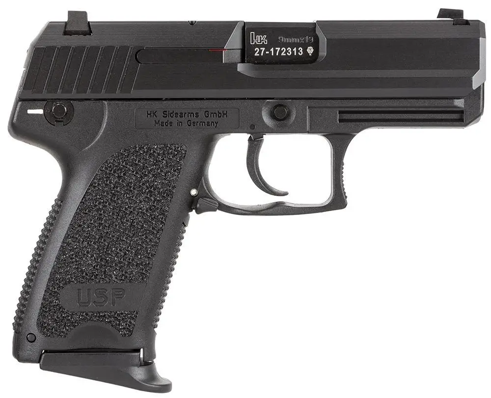 The HK USP (Universal Self-loading Pistol) is an accurate and ultra-reliable handgun. It utilizes a fiber-reinforced polymer frame stiffened by stainless steel inserts at areas subject to stress and friction. The control lever, a combination safety and decocking lever, is frame mounted and quickly accessible, unlike the slide-mounted safeties. The modular design of the USP's internal components allows the control lever function to be switched from the left to the right side of the pistol for left-handed shooters. The USP Compact is smaller and lighter than large frame USPs. The reduction in trigger reach and grip circumference increases concealability and enhances shooting ergonomics. It utilizes a narrow, full-hand grip frame with a choice of interchangeable extended or flush-fitting magazine floorplates. The USP Compact features a polygonal bore barrle, one-piece steel slide with contoured, extended release, bobbed hammer, universal mounting grooves, and ambidextrous magazine release lever. This V1 model has a black frame with blued slide, captive recoil spring assembly with polymer absorber bushing, 3-dot sights, and comes with two 13-round magazines.