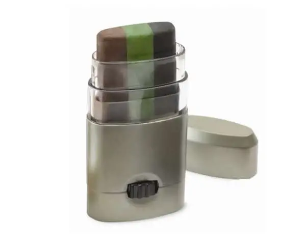HME's Camo Face Paint stick is a long lasting non-glare face paint that comes in a "mess free" application stick. It features the most popular colors for effective camouflage; black, brown and dark green.