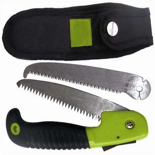 The HME Products Folding Saw Combo Pack includes a 5' wood blade and 5' bone blade. The bone blade has a built-in stop to prevent the blade from coming out of the cutting groove until the cut is finished. The wood blade aggressively cuts on each pull stroke. Its one screw removal allows you to switch the blades in seconds. Includes a scabbard with belt loop for safe storage and transport.