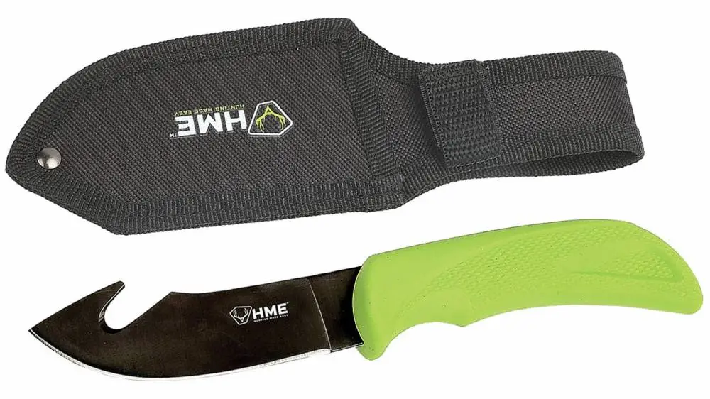 HME's Fixed Blade with Gut Hook is constructed of 420HC steel with a black oxide finish. The fixed, zipper gut-hook blade is designed for quick, efficient field dressing. Its handle is made of non-slip Thermoplastic rubber. Included is a heavy-duty sheath.