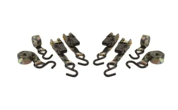 These must-have accessories are useful for many outdoor activities. Use for tying down equipment or to update worn and weathered tree stand ratchet straps. They feature 1" x 8' polyester straps with vinyl coated S hooks, spring loaded keepers, zinc plated ratchets, and a working load of 500 lbs. The breaking strength of the straps is 1500 lbs.